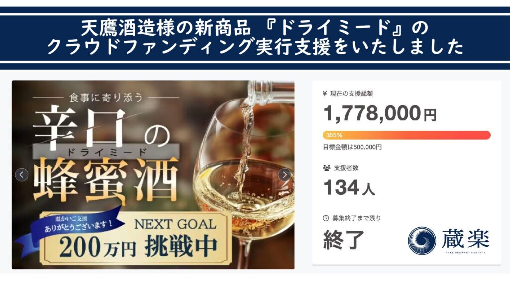 栃木県大田原市で100年以上の歴史を持つ酒蔵、天鷹酒造様のクラウドファンディングの実行支援を行いました。 プロジェクトの内容は、世界最古の酒ミード(蜂蜜酒)の常識を覆す、「食中酒としてのドライミード」という全く新しいジャンルの開拓でした。 結果は、クラウドファンディングで支援額355%(1,778,000円)達成。134名の方から支援を集めました。 天鷹酒造×蔵楽で挑んだ今回のプロジェクトの裏側をご紹介します。 ご相談前の課題 天鷹酒造様がクラウドファンディングの実施を検討する中で、以下のような課...