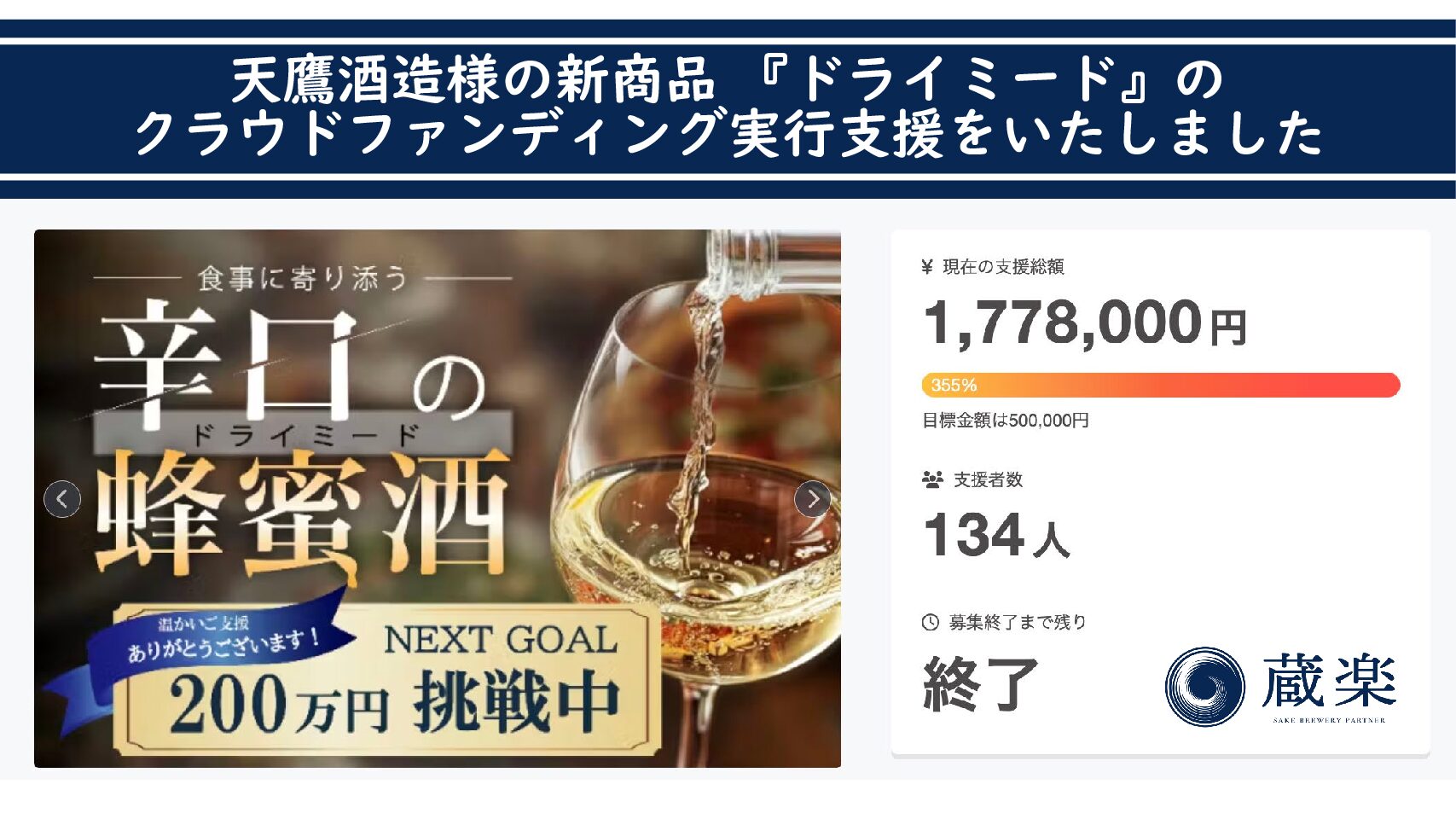 結果は、クラウドファンディングで支援額355%(1,778,000円)達成。