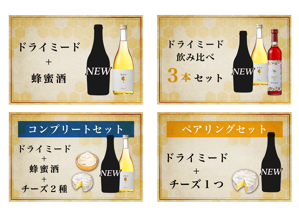 天鷹ミードシリーズ3種を贅沢に飲み比べできるセットや、ペアリングを意識したものなど、ミードの味わいの違いを楽しめるリターン品です。